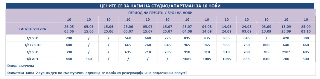 Такса за престој, во висина од 2 еврa по сместувачка единица на ден се плаќа во агенција со резервација и не подлежи на попусти!